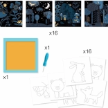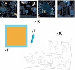 - 1 suport din spumă și carton gros, 16 fundaluri ilustrate, 16 șabloane, 1 ac de perforat, 1 caiet cu instrucțiuni