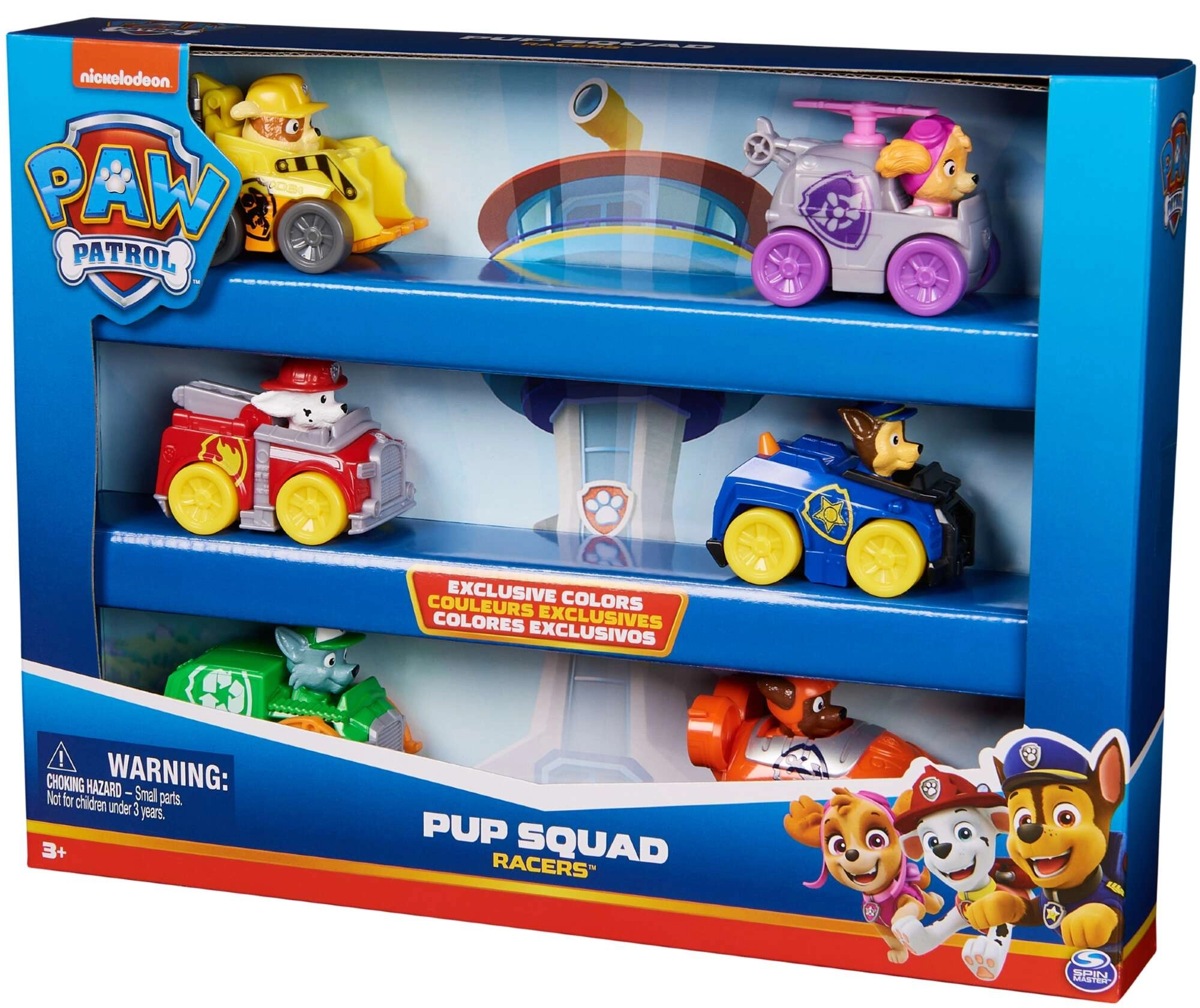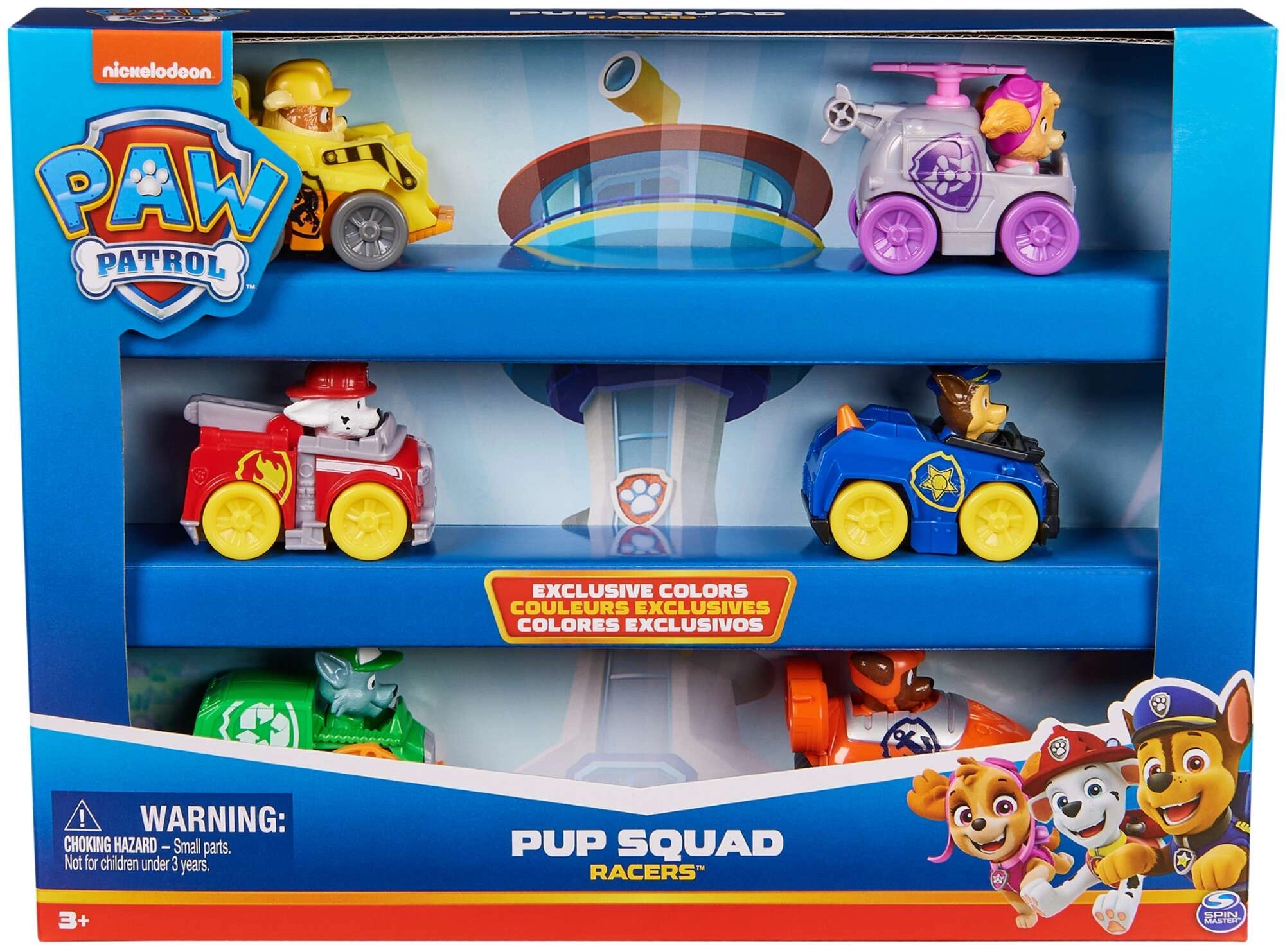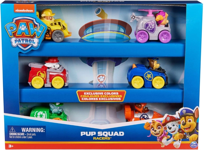 Setul Pup Squad Racers include șase vehicule detaliate, cu figurinele eroilor PAW Patrol fixate ferm – Chase, Marshall, Skye, Rocky, Rubble și Zuma. Mașinuțele sunt fabricate din plastic rezistent, au propulsare prin împingere și, datorită dimensiunilor mici, sunt ușor de manevrat și transportat.
