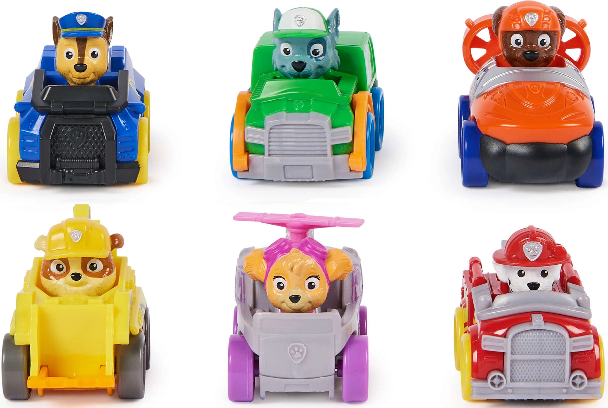 Chase, Marshall, Skye, Rocky, Rubble și Zuma în mini vehicule pregătite pentru orice misiune. Ideal pentru colecționare și joacă împreună.