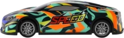 Modelul este realizat din plastic rezistent, care face față utilizării obișnuite de către copii. Mixul de culori și autocolantele oferă mașinuței un aspect atractiv – de la portocaliu intens până la combinații multicolore îndrăznețe.