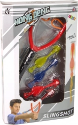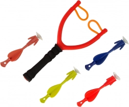 Pachetul conține o prastie roșie și patru proiectile colorate cu ventuze pentru un joc sigur.