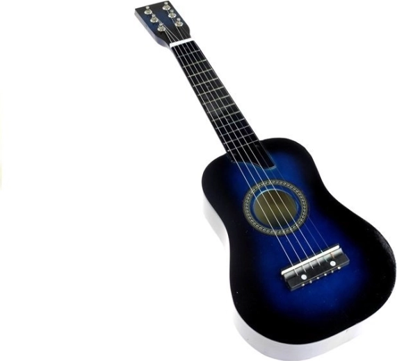 Chitară din lemn pentru copii, de 60 cm, în culoare albastră, oferă o experiență de cântat autentică pentru cei mici. Oferă 6 corzi, posibilitatea de acordare cu ajutorul mecanismelor, iar în pachet este inclusă o pană. Lemnul lăcuit și prelucrarea atentă asigură un sunet realist. Potrivită de la 3 ani, certificare CE.