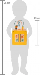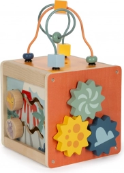 Labirintul cu mărgele de pe partea superioară a cubului dezvoltă coordonarea mână-ochi și abilitățile motorii fine.