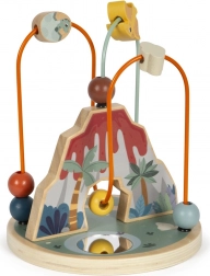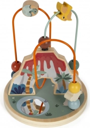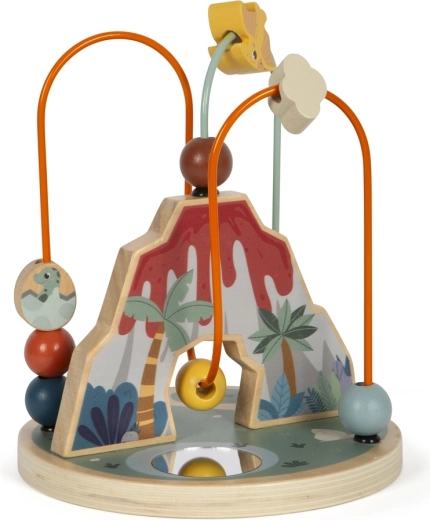 Acest labirint cu mărgele cu motiv de dinozauri reprezintă o jucărie ideală pentru dezvoltarea copilului. Îi învață coordonarea mână-ochi și stimulează creativitatea, atrăgând prin figura sa originală de vulcan. Jucăria include două bucle colorate cu mărgele diverse și o oglindă centrală plasată la bază, permițând astfel să fie vizibil orice dintr-un alt unghi.