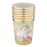 Aceste pahare din hârtie, cu un motiv de unicorn fermecat, vor aduce petrecerii tale o atmosferă de basm. Datorită volumului practic de 250 ml, sunt ideale pentru sucuri, limonade și apă. Marginea aurie elegantă completează decorul festiv al mesei și se combină ușor cu alte accesorii de petrecere.