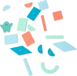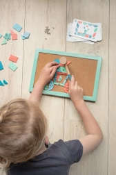 Conținutul pachetului: tablă de plută 19 × 29 cm, 10 carduri cu șabloane 8 × 13 cm, 33 forme din lemn, ciocănel din lemn. Fabricat din lemn, plută și metal de calitate pentru rezistență și utilizare de durată.