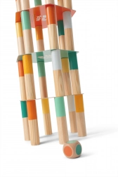 Joc din lemn distractiv pentru 2–4 jucători de la 5 ani, care pune la încercare îndemânarea și răbdarea. Construiți un turn stabil și, pe baza aruncării cu zarul, scoateți cu grijă stâlpii fără ca structura să se prăbușească. Jocul dezvoltă motricitatea fină, coordonarea ochi–mână, gândirea logică și cooperarea jucătorilor.