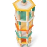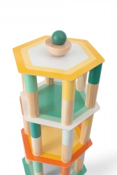 Platformele hexagonale și stâlpii colorați creează o construcție stabilă, dar fragilă. Fiecare piesă îndepărtată schimbă centrul de greutate și sporește provocarea.