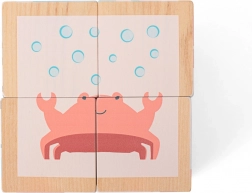 Acest puzzle din lemn aduce copiilor bucuria descoperirii – este suficient să rotească corect cuburile și să găsească toate părțile unui animal. Principiul simplu motivează la joacă repetată, care sprijină în mod natural concentrarea, recunoașterea culorilor și formelor, precum și răbdarea.