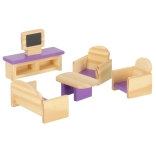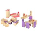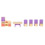 Set stilat de mobilier din lemn pentru căsuța de păpuși, în nuanțe de mov și roz, care va încânta orice mic designer. Conține până la 19 piese pentru living, dormitor, baie și bucătărie. Fabricat din lemn de calitate, șlefuit fin și lăcuit în siguranță. Susține creativitatea, motricitatea fină și jocul realist.