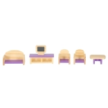 Piese de design cu accente mov vor înfrumuseța căsuța – canapea cu fotolii și măsuță TV pentru living, plus mobilier de bucătărie, masă și scaune pentru mese împreună.