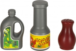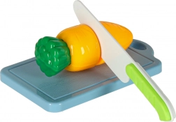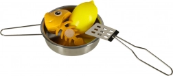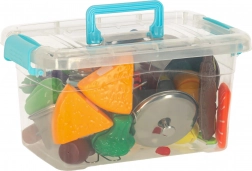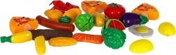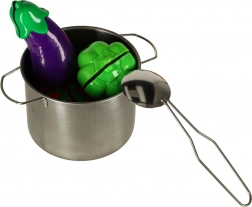 Acest set versatil de alimente și veselă pentru copii oferă o experiență realistă de gătit în bucătăria de jucărie. Bucățile de fructe și legume se separa pe segmente și pot fi „tăiate” cu un cuțit de plastic sigur pe un tocător. Oalele metalice, tigaia, strecurătoarea și farfuriile adaugă autenticitate jocului.