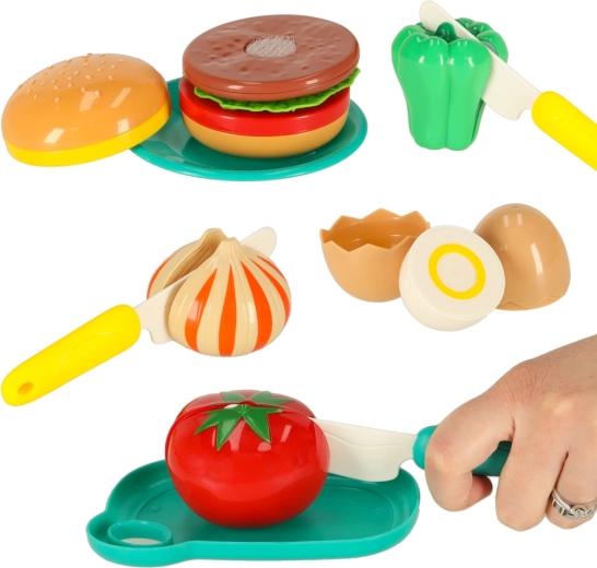 Setul amplu pentru bucătăria copiilor include tot ce au nevoie micii bucătari: pizza în felii, hamburger, legume, fructe și dulciuri. Piesele sunt împărțite în jumătăți și unite prin benzi cu arici, astfel încât copiii pot exersa în siguranță tăierea, servirea și pregătirea unui meniu pentru toată familia.