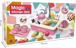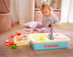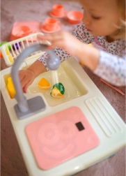 Oferiți-le copiilor propriul lor colțișor de bucătărie. Chiuveta realistă cu pompă de apă funcțională (alimentare 2× AA, neincluse) permite clătirea veselei ca într-o bucătărie adevărată. Setul bogat de accesorii stimulează imaginația, învață obiceiuri corecte și dezvoltă abilitățile de coordonare.