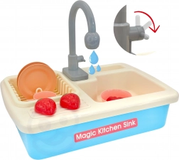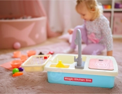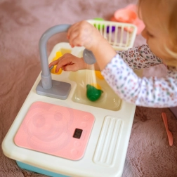 Pompa integrată, după introducerea a 2× AA, pune apa în mișcare în chiuvetă. Copiii se bucură de clătirea realistă a veselei și joacă sigură fără mizerie.