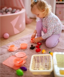 Setul include farfurii, boluri, căni, tacâmuri, ceainic, tocător și alimente din plastic cu scai (fructe și legume) pentru o „tăiere” sigură. Copiii își pot pregăti meniul, servi și apoi spăla vesela – de la joc la responsabilitate e doar un pas.