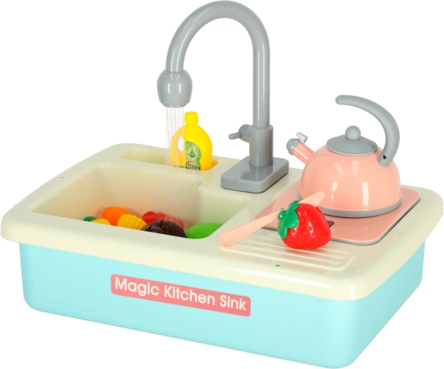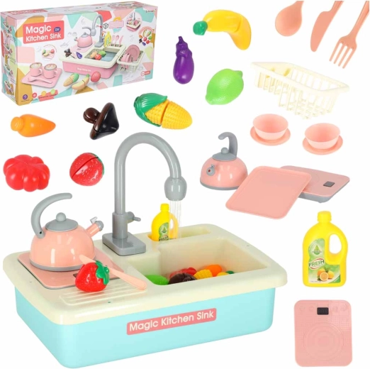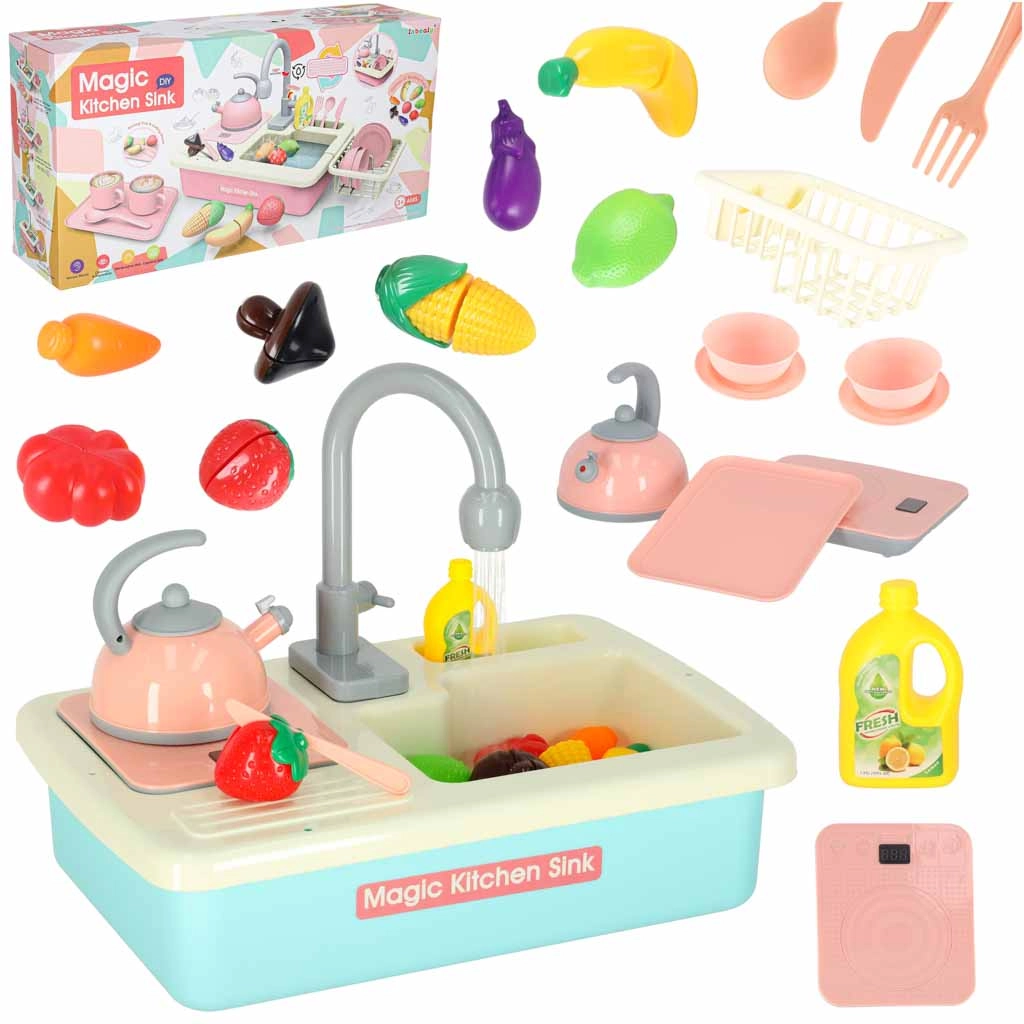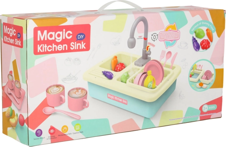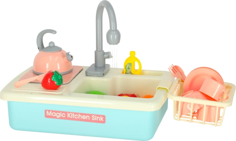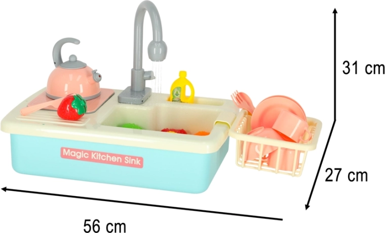 Descoperă amuzanta chiuvetă de bucătărie pentru copii cu circulație reală a apei, care transformă activitățile obișnuite în joacă. Setul în culoare albastră susține învățarea responsabilităților casnice, dezvoltă motricitatea fină și creativitatea. Sunt incluse veselă, tacâmuri, un ceainic, o planșetă de tăiat și fructe și legume colorate pentru tăiat. Bateria robinetului este alimentată de 2× baterii AA (nu sunt incluse).
