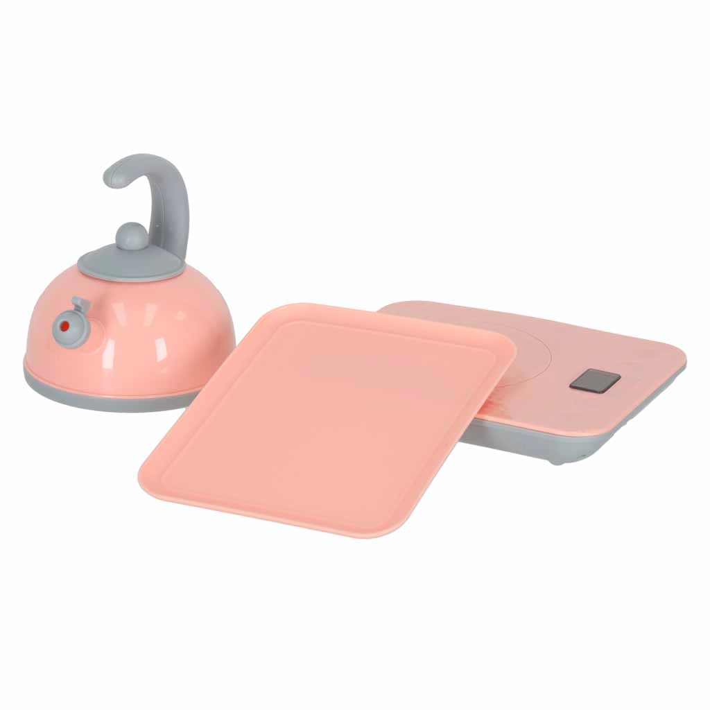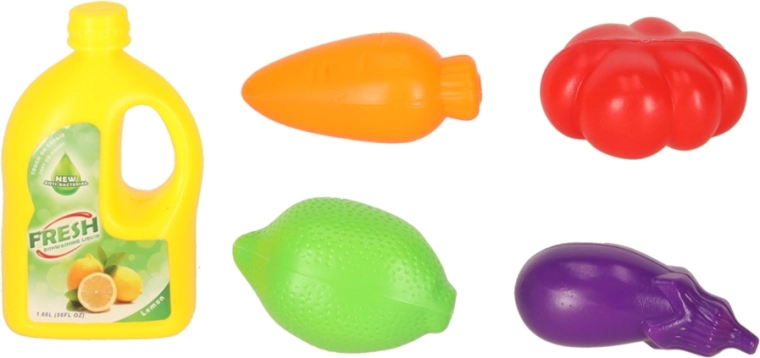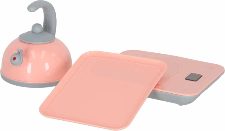 - chiuvetă, „plită/bucătărioară”, ceainic, planșetă de tăiat, 2× bol, 2× farfurie, 2× cană, tacâmuri (lingură, furculiță, cuțit), accesorii și alimente din plastic (de ex. roșie, limetă, vânătă, banană, căpșună, porumb, ciupercă, morcov)