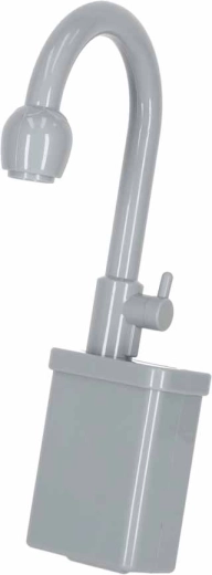 Robinetul funcțional cu pompă recirculă apa după introducerea a 2× baterii AA. Copiii pot clăti vesela și „produsele” ca la o chiuvetă adevărată.