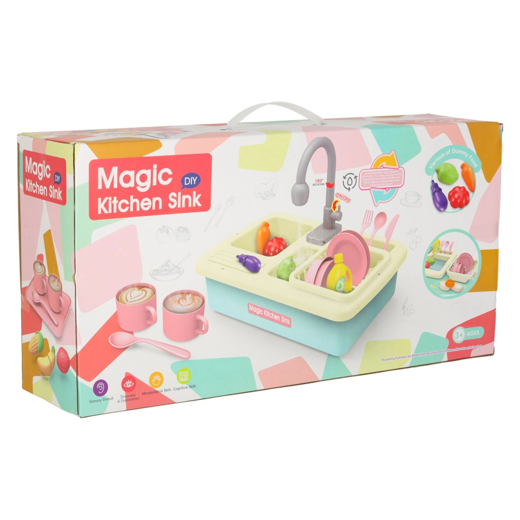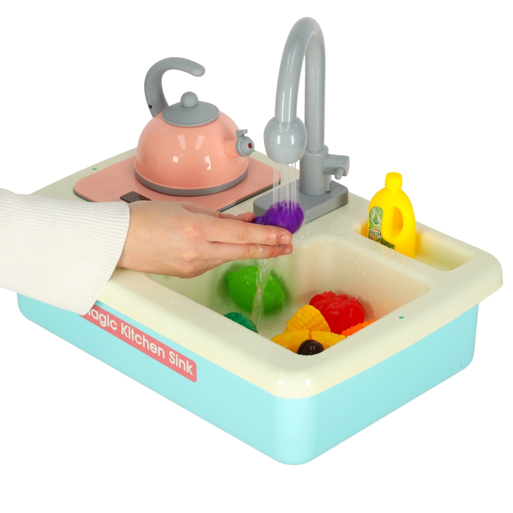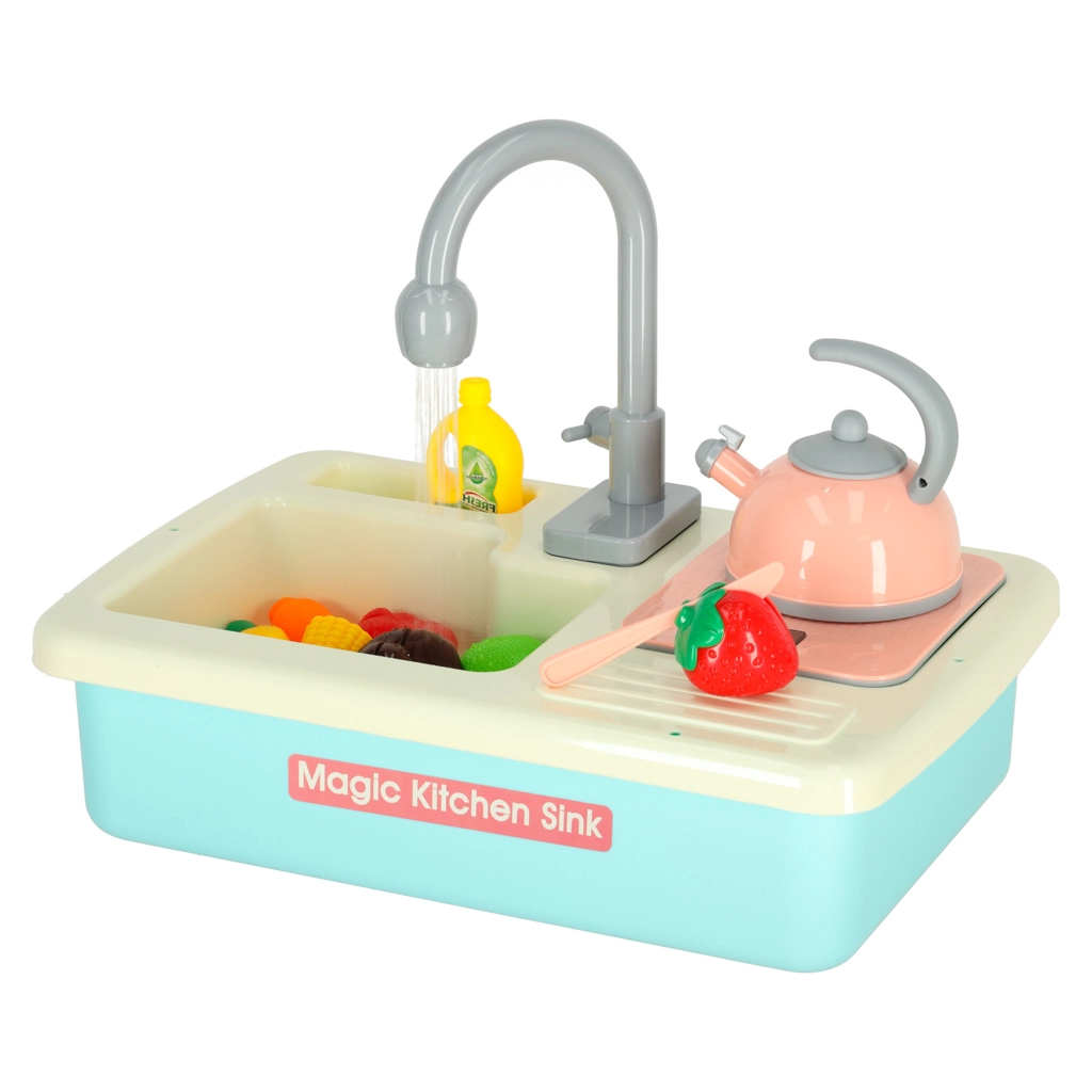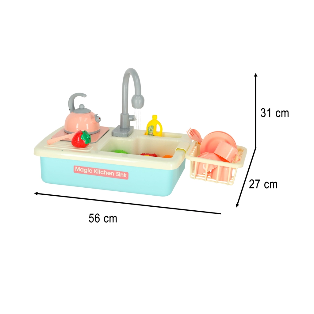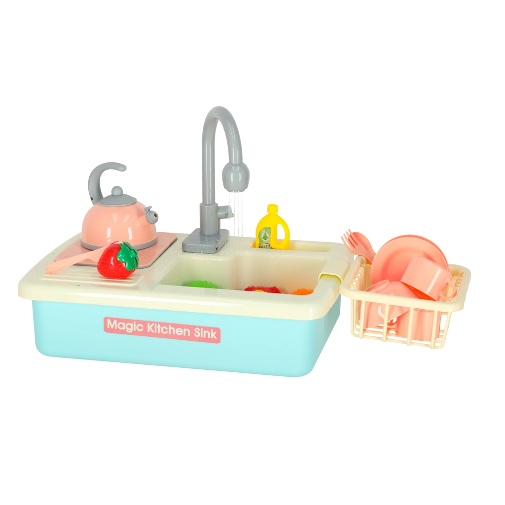 Această chiuvetă realistă pentru copii funcționează aproape ca una adevărată – după introducerea bateriilor, pompa pornește circulația apei, astfel încât copiii pot spăla vesela și pot învăța responsabilitatea în bucătărie. Jocul conduce în mod natural la conștientizarea economisirii apei și susține abilitățile practice.