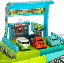 - 4 mașinuțe, volan, lift, piese de pistă pentru asamblare, autocolante, hartă de joc a orașului