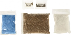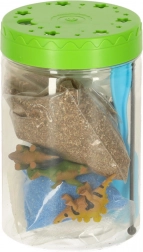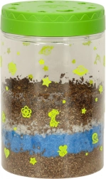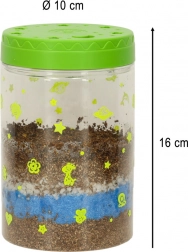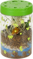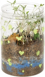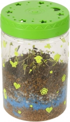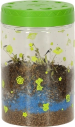 Recipientul din plastic transparent cu orificii de ventilație este ideal pentru plantarea semințelor furnizate. Setul include pământ și pietre colorate pe care copiii le plasează conform instrucțiunilor. LED-urile din capacul terariului susțin creșterea plantelor, oferind în același timp o lumină de noapte delicată.