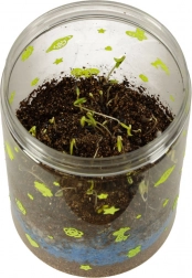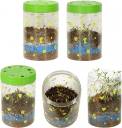 Recipientul transparent cu orificii de ventilație permite observarea creșterii plantelor. Conține toate componentele necesare pentru a crea o grădină frumos stratificată.