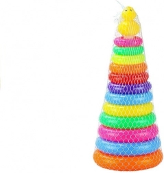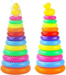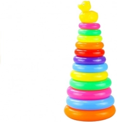 Piramida de inele este o jucărie clasică, care acum vine într-o versiune frumos colorată. Nu doar că ajută la dezvoltarea motricității și abilităților motorii ale copilului, dar și a concentrației, abilităților manuale, și oferă posibilități de recunoaștere a dimensiunilor, sortare după dimensiuni, nuanțe de culori sau după propriile reguli și logică. Cu această jucărie colorată, fabricată din plastic sigur și moale, copilul dumneavoastră se poate distra chiar și în timpul băii. Rățușca galbenă situată în vârful piramidei face joaca și mai interesantă. Piramida de inele este o investiție de durată, care nu doar că deschide copilului lumea fanteziei, dar îl și dezvoltă pe multe niveluri.