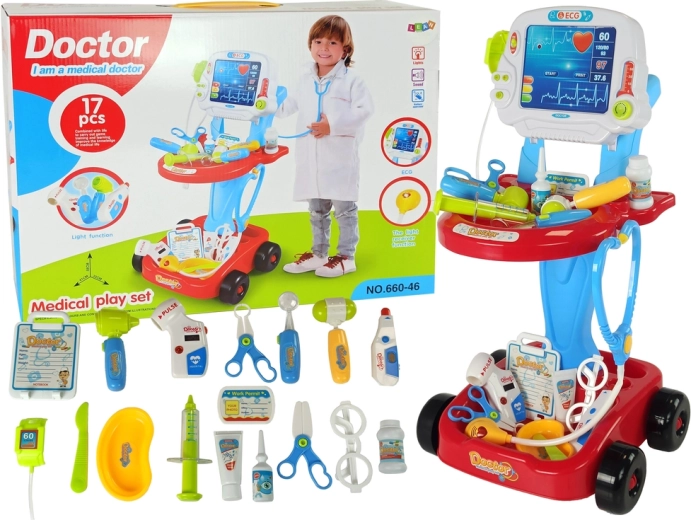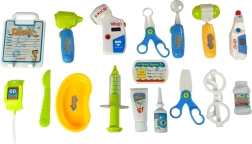 - Cărucior/panou EKG, ochelari, stetoscop cu sunet, termometru cu reglaj și iluminare, otoscop cu lumină, tensiometru cu setare și iluminare, ciocănel, seringă, oglindă dentară cu lumină, 2× foarfeci chirurgicale, bisturiu, bol, imitație cremă dezinfectantă, imitație picături pentru ochi, imitație recipient cu medicamente, ecuson medic, card pacient