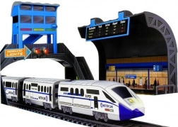 Această cale ferată aduce în camera copilului lumea autentică a trenurilor. După asamblare, obții un circuit stabil cu dimensiuni de aproximativ 106 × 44 cm, pe care rulează o garnitură modernă alb-albastră. Gara, podul și stația oferă jocului o atmosferă realistă și susțin poveștile creative.