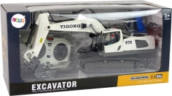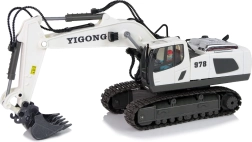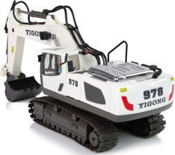 Acest excavator telecomandat, alb cu detalii negre, reproduce fidel o utilaj de construcții real. Datorită tehnologiei 2,4 GHz eviți interferențele și te bucuri de control cursiv. Telecomanda cu două joystick-uri permite mers înainte/înapoi și stânga/dreapta, rotirea cabinei și lucru precis cu cupa.