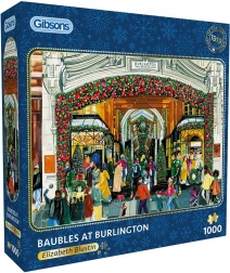 Puzzle-ul „Decorațiuni în Burlington” de la Gibsons surprinde atmosfera de Crăciun din Burlington Arcade, Londra. Ilustrația este realizată de Elizabeth Blustin, care a redat o galerie bogat decorată cu ornamente și lumini de sărbătoare. Odată asamblat, puzzle-ul măsoară 68 x 49 cm și oferă spațiu suficient pentru a te bucura de detalii.