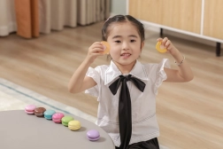Două jumătăți ale fiecărui macaron sunt unite cu bandă cu arici – copiii le pot separa și reasambla în „arome” noi, exersând degetele și coordonarea.