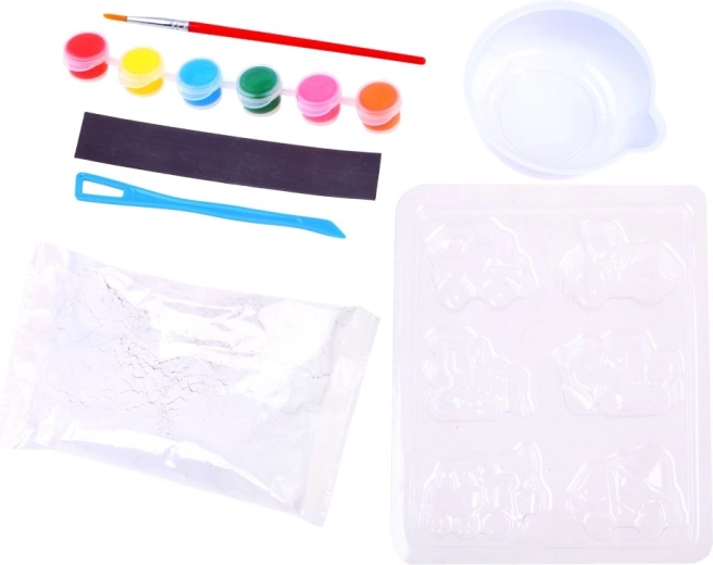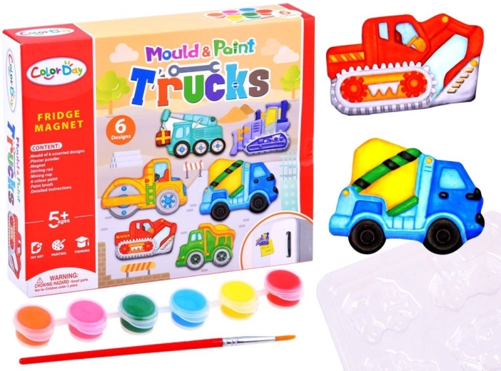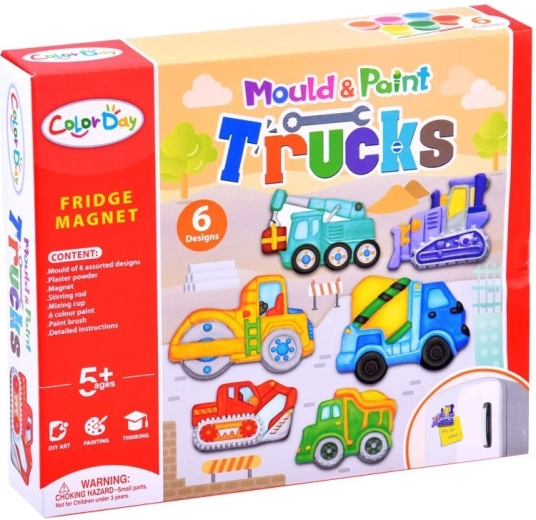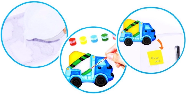 Acest set DIY ingenios îi va încânta pe toți copiii care adoră să creeze. Dintr-un amestec de alabastru vei turna formele utilajelor de construcții, după uscare le vei colora cu vopselele incluse și la final vei lipi banda magnetică. Ușor, curat și extrem de distractiv!