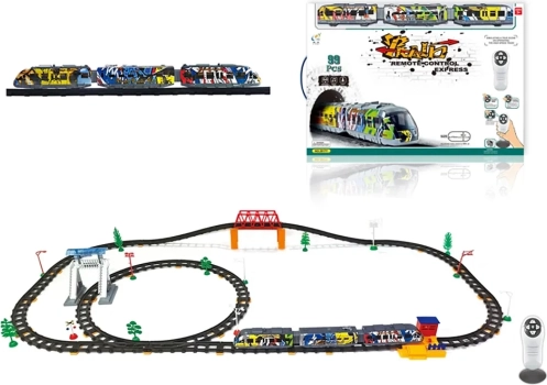 - Conținutul pachetului: locomotivă, 2 vagoane, șine, telecomandă cu ventuză, stație, macaz, copaci, indicatoare