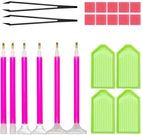 Set de 22 accesorii pentru broderie/pictură cu diamante (diamond painting). Set complet pentru a începe aventura ta cu mozaicul din diamante. Setul include 6 stilouri cu capete interschimbabile, 2 pensete, 4 tăvi pentru diamante și 10 pătrățele de adeziv.