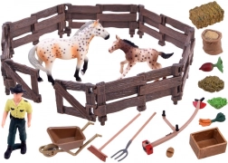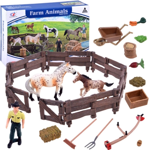 Acest set generos echipat îi poartă pe copii în lumea fermei. Include două figurine de cai fidel redate (iapă și mânz), fermier, țarc și numeroase accesorii precum roabă, furcă, greblă, jgheab și hrană. Detaliile realiste, de la textura „lemnului” de pe gard până la coloritul cailor, stimulează imaginația și ore întregi de joacă.