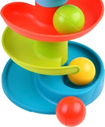 Setul include șase bile intens colorate și șase platforme spiralate, care creează o pistă atrăgătoare, lină, plină de mișcare și sunet.