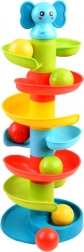 Această pistă spiralată colorată, cu un simpatic elefănțel în vârf, cucerește instant copiii. Cele șase platforme colorate formează o pistă lină pe care bilele se rostogolesc sprinten, în timp ce zornăie plăcut. Elefănțelul are o urechiușă moale din cauciuc, potrivită ca mușcător delicat pentru dințișorii în erupție.
