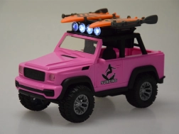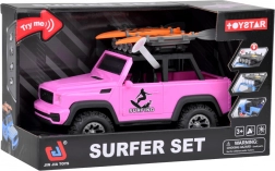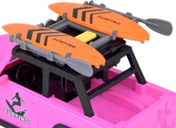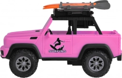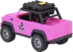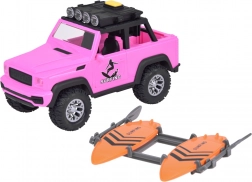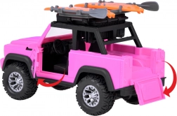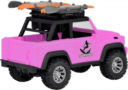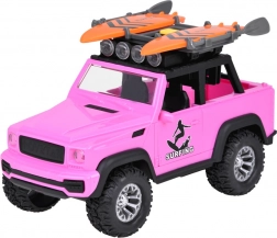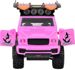 Mașina off-road roz, stilată, pentru micii aventurieri, oferă efecte luminoase și sonore, uși care se deschid, capacul portbagajului rabatabil și roți mari din cauciuc cu profil pronunțat. Pe acoperiș găsești un suport cu două plăci de surf și un panou luminos pentru un joc și mai realist.