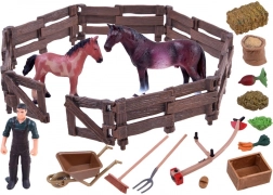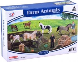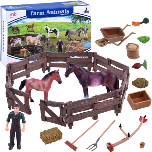 - Figurină fermier (~9 cm), cal (aprox. 11 × 13,5 × 3 cm), mânz (aprox. 9 × 10 × 2 cm), țarc cu poartă, roabă, iesle, furcă, greblă, mătură, sac cu boabe, balot de fân, legume (varză, sfeclă, morcov)