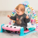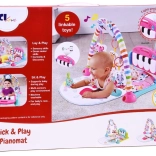 Acest covoraș de joacă multifuncțional oferă mai multe moduri: pentru stat pe spate cu lovit în clape, pentru antrenament pe burtică cu jucării la îndemână și pentru stat în șezut, când pianul poate fi setat ca mini măsuță interactivă. Melodiile, efectele luminoase și proiectorul creează o atmosferă plăcută și susțin stimularea senzorială.