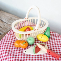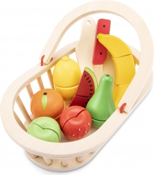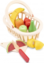 Setul include tocător, cuțit din lemn sigur și o varietate de fructe colorate: pepene, căpșună, pară, măr, lămâie, banană și portocală. Totul este depozitat într-un coș solid din lemn, util pentru depozitare ușoară și pentru jocul de-a cumpărăturile.