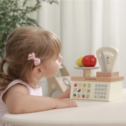 Cântar din lemn stilat pentru micii comercianți, care aduce învățarea prin joc. Copiii își exersează calculul, măsurarea greutății și jocurile de rol cu fructe și legume. Mecanismul pe arc integrat mișcă indicatorul în funcție de încărcare, iar butoanele colorate cu cifre și imagini susțin creativitatea și comunicarea. Un accesoriu ideal pentru bucătăria sau magazinul de jucărie.