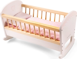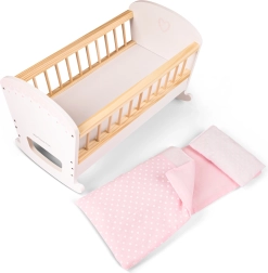 Un leagăn din lemn fermecător pentru păpuși sau plușuri. Leagănul este echipat cu o saltea moale, o pătură și o perniță, astfel încât păpușile se pot odihni mereu confortabil și la căldură.