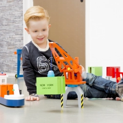 Susține imaginația copiilor și le permite să inventeze propriile povești din port. Manipularea macaralei dezvoltă coordonarea mâinilor și motricitatea fină, în timp ce elementele magnetice facilitează ridicarea și mutarea „containerelor”.