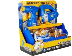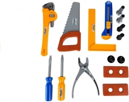 Acest atelier multifuncțional pentru copii, într-o valiză, aduce tot ce are nevoie micul meșter: șurubelnițe, fierăstrău mic, riglă, clești, cuțit cu lamă segmentată, piesă „din lemn” și, mai ales, bormașină/șurubelniță pentru copii și fierăstrău pendular. Uneltele sunt fabricate din plastic ușor de calitate, în culori neutre, și prin aspectul lor amintesc fidel de uneltele reale – ideale pentru jocul de imitație și primele proiecte de bricolaj.