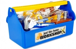 Set amplu de unelte din plastic – fierăstrău mic, clești, șurubelnițe, riglă și altele – totul într-o cutie robustă WORKSHOP pentru transport ușor.