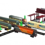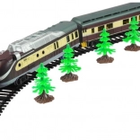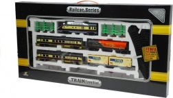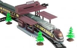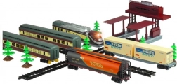 - Set bogat: locomotivă, 4 vagoane, copaci, șine și macazuri