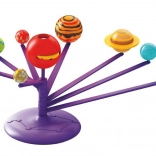 Confecționează din tije un suport pentru planete, fixează planetele pe brațe și pictează-le. Seara pornește proiectorul și bucură-te de priveliștea planetelor care se rotesc.